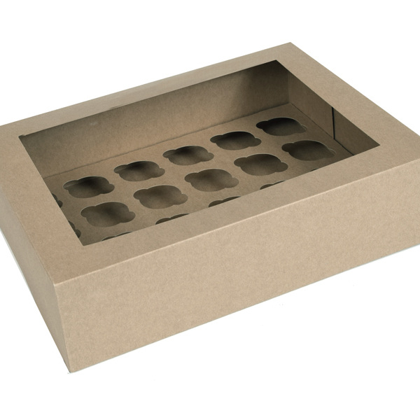 24 mini cupcake VENSTERdoos Kraft incl inleggers FSC, recycled, Composteerbaar,PLA venster 9cm hoog