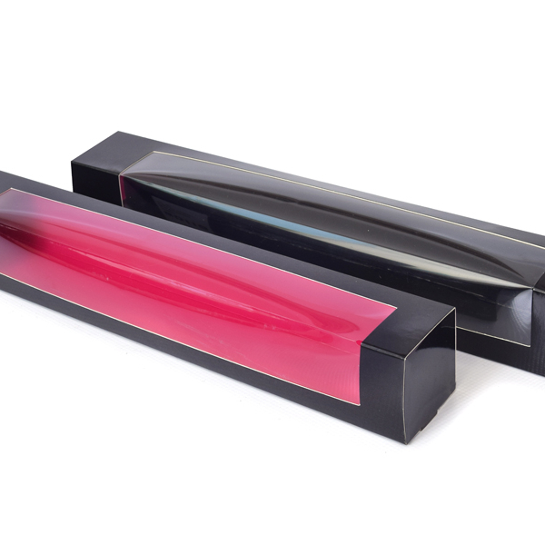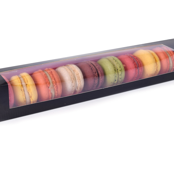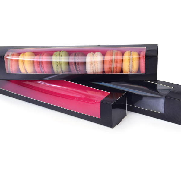 Bestaat uit huls en interieur, interieur 2 zijdig gekleurd (roze en zwart) daardoor 2 kleuren te gebruiken. 9-12 macarons, 315x47x47mm.