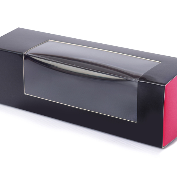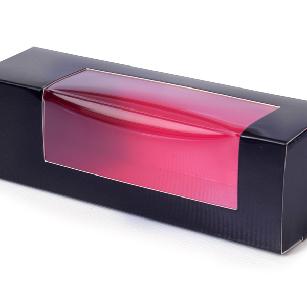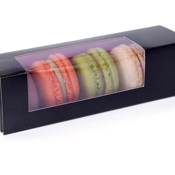 Bestaat uit huls en interieur, interieur 2 zijdig gekleurd (roze en zwart) daardoor 2 kleuren te gebruiken. 4-6 macarons, 159x47x47mm